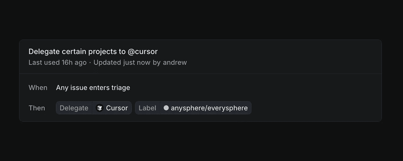 • Trigger agents directly from Linear: Delegate an issue to @Cursor or mention @Cursor in a comment to launch an agent that will work on the task.