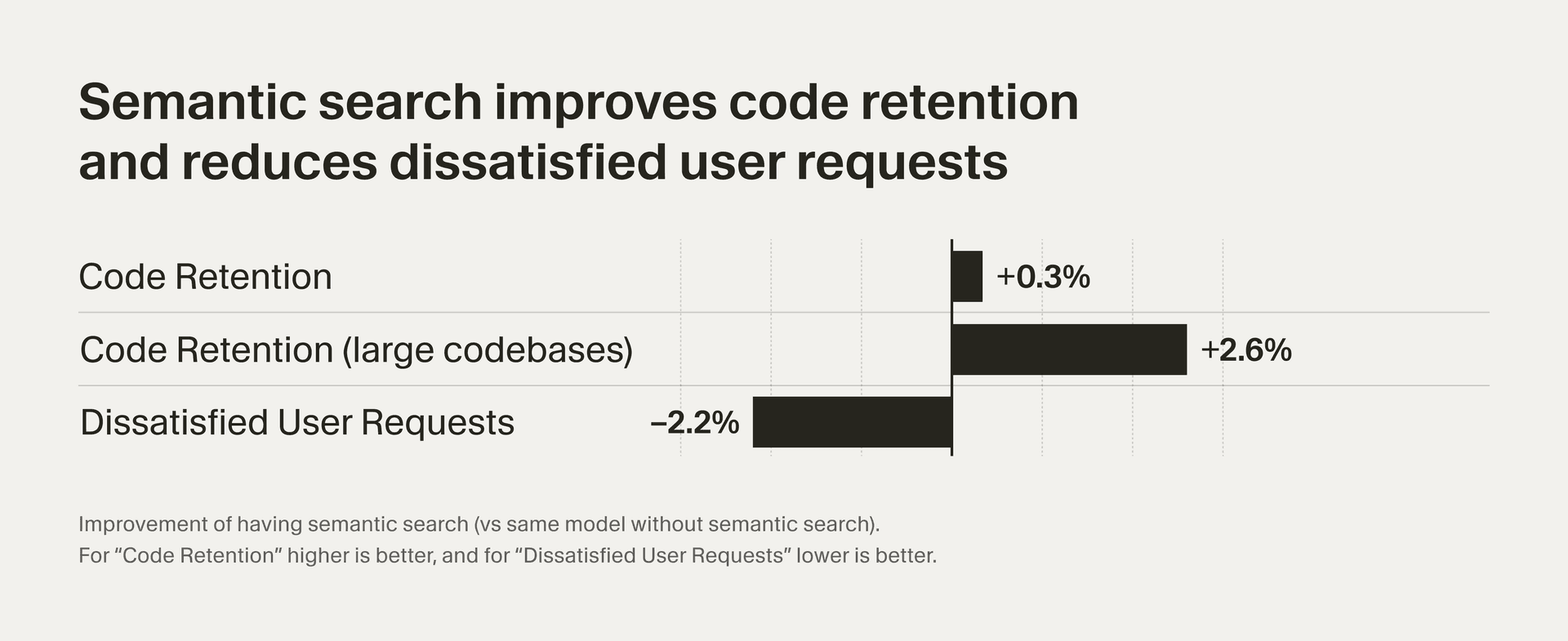 Code Retention: Code written by effective agents is more likely to remain in user codebases. We see agent code retention increases by 0.3% when semantic search is available. This effect increases to 2.6% on large codebases with 1,000 files or more.